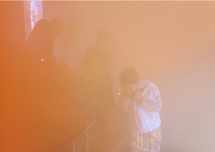 亲身体验,加深印象。警报响起,烟雾弥漫着整个楼层,干部职工们运用培训课上所学知识,将打湿的毛巾折叠后捂住口鼻,一个接着一个井然有序地撤离至安全空地。